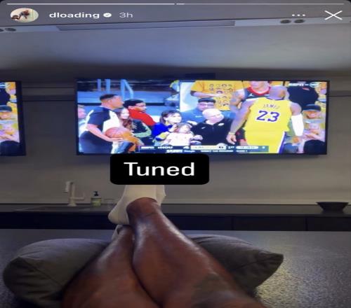 前湖人球员德安吉洛·拉塞尔更新个人社媒晒出自己观看火湖G1的直播并配文写道:“微醺了。”