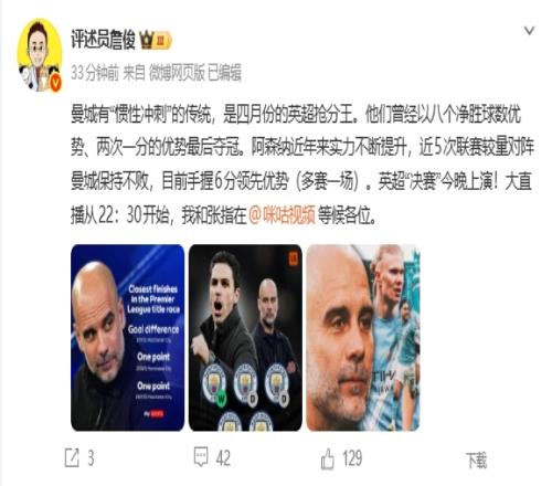 体育播报04月19日宣 知名评述员詹俊在社媒发文,谈到了今晚曼城与阿森纳比赛。